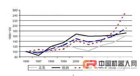 各區域用戶工業機器人定購指數(以1996年作為100)